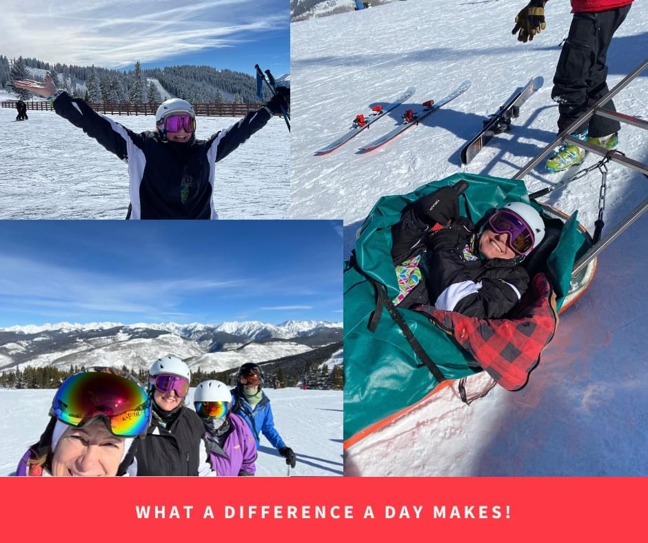 It was a beautiful second morning in the snow. We skied several runs, then headed in to eat lunch. Just before I got to the lift my turn went wrong. I went one way, my knee went the other, and my skis didn’t release. Long story short, I traveled down the mountain in a burrito behind an incredible ski patrol woman. In the ski hospital ER, the doctor discovered a tibial fracture. He said I tried really hard to tear my ACL, but it looks like I only sprained the meniscus.